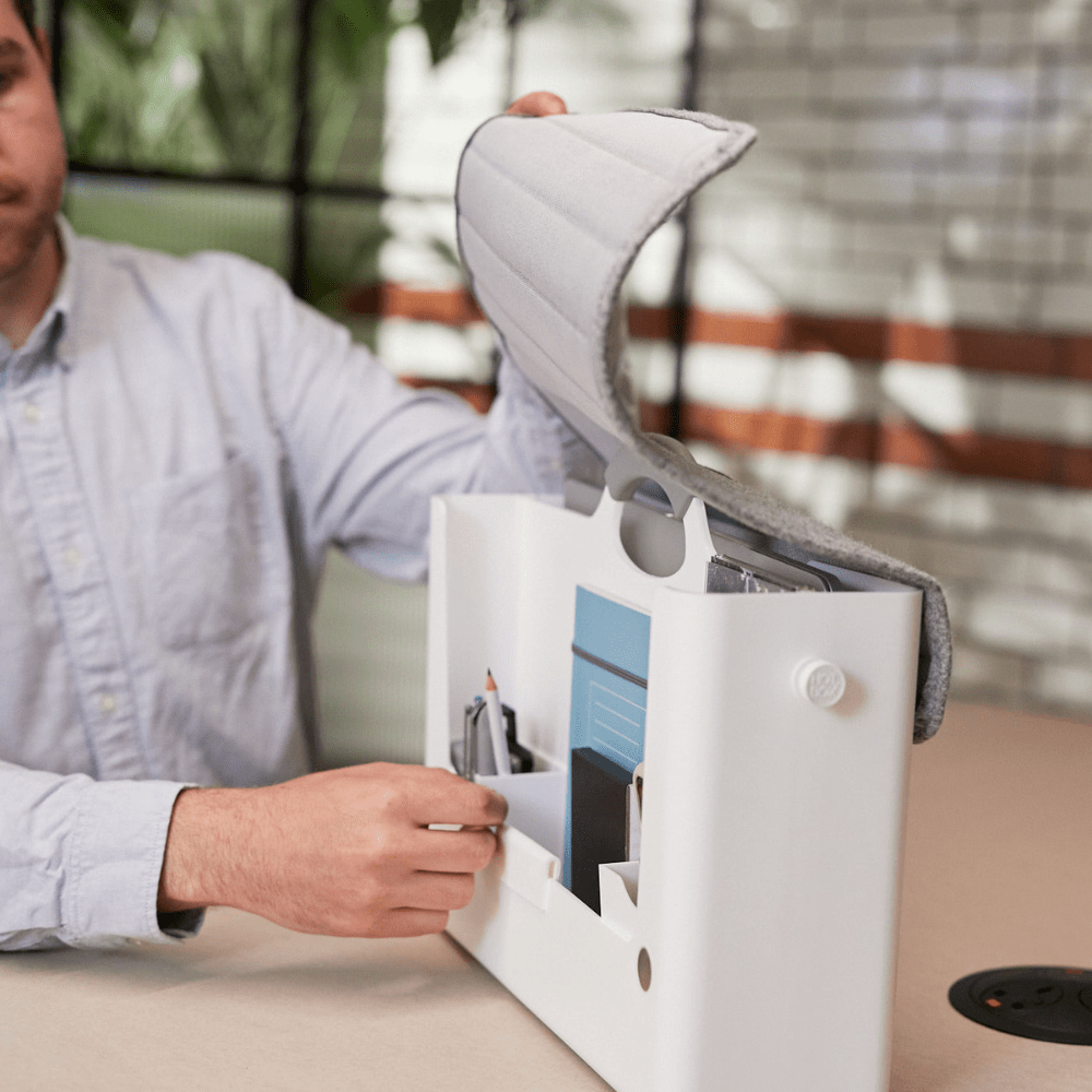 Die Hotbox 2 ist unser Arbeitstier im Büro. Sie passt perfekt in die Schränke und wurde entwickelt, um die Einrichtung des Arbeitsplatzes zu vereinfachen. Mit einem Laptop-/Tablet-Fach, einer praktischen Trennwand, Stiftefächern und austauschbaren Stoffbezügen Ihrer Wahl organisiert die Hotbox alles und sieht dabei auch noch gut aus.